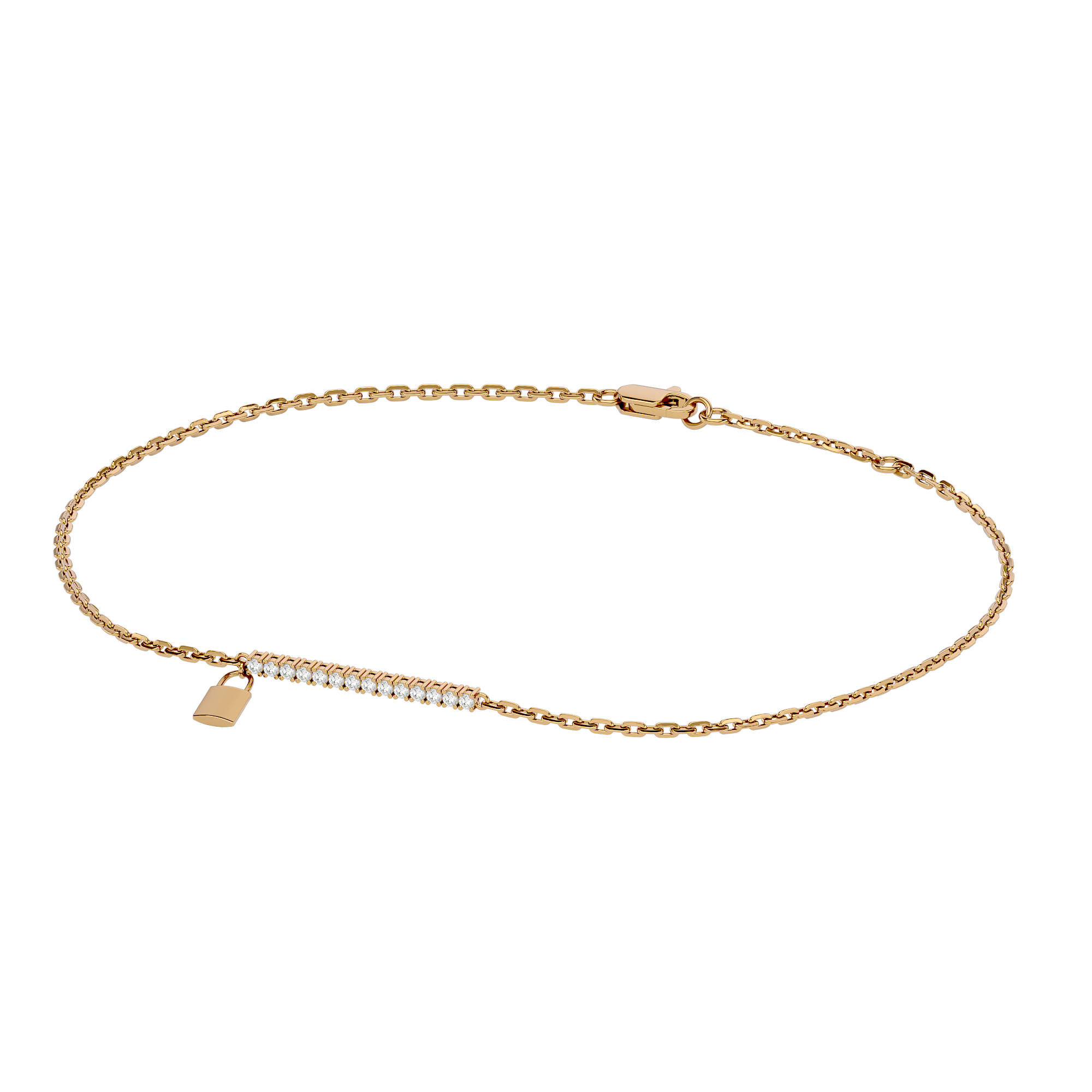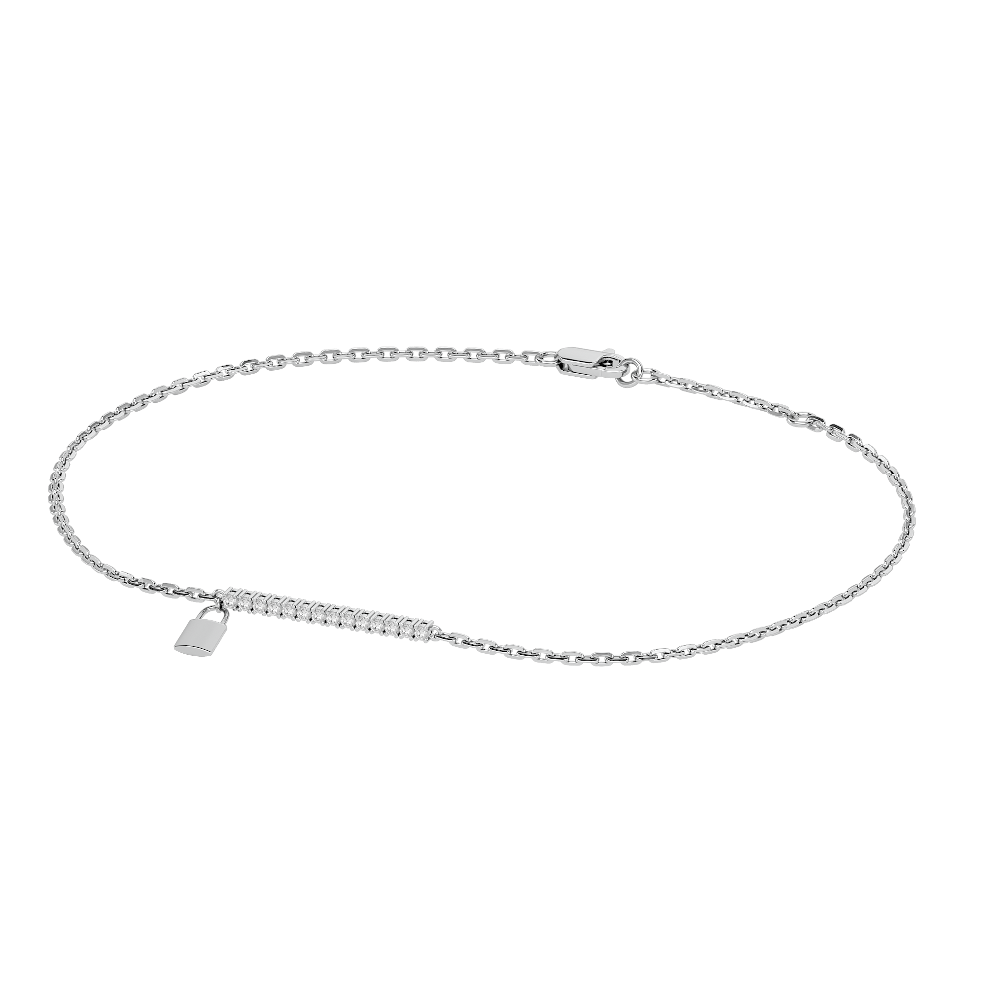 A dazzling testament to timeless elegance and opulent craftsmanship, our "Locked In" Bracelet is crafted from the finest 935 silver and spakling lab-grown diamonds. A gleaming metal lock dangles from a delicate string of lustrous diamonds, creating a striking focal point that commands attention with every movement. The brilliance of the diamonds captures the the eye, casting a spell of enchantment wherever you go. Whether worn as a standalone statement piece or paired with other treasures from your collection, the "Locked In" Bracelet is sure to captivate hearts and turn heads, leaving a lasting impression of glamour and sophistication.Product SpecificationsSize: 6.5 inches with Bolo ChainSilver Weight (grams): 3.18Diamond Weight (carats): 1.02Diamond Details: Colour: E-FClarity: VS-SICut: ExcellentNote: Silver Weight and Diamond Weight may vary as per actuals.