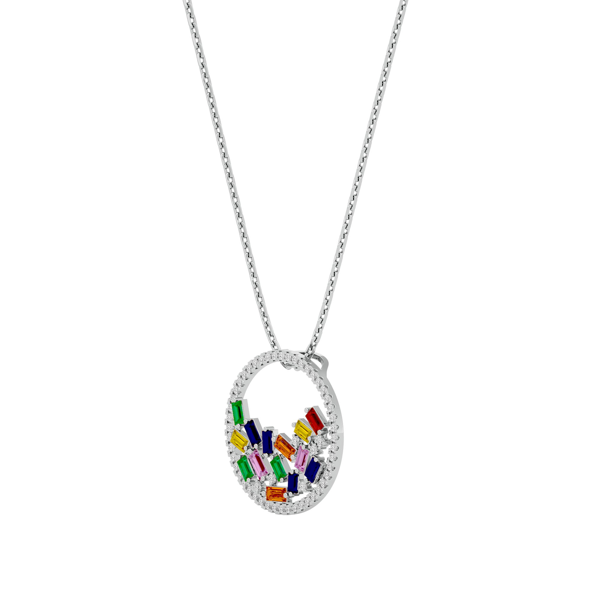A fusion of sophistication and allure, our "Taste the Rainbow" circle gemstone pendant is crafted from the finest 935 silver and studded with sparkling lab-grown diamonds. At its core, a delicate circle, meticulously hollowed to evoke a sense of depth and intrigue beckons curious admirers to look within in search of beauty. The beauty of the lab-grown diamonds adorn the outer rim of the circle.But what truly sets this pendant apart is the breathtaking display of colour at its heart. Nestled within the hollow circle, a stunning array of colourful baguette gemstones graces the bottom, creating a mesmerizing contrast against the brilliance of the diamonds. The rainbow glimmers with its own unique hues, adding depth and dimension to the design and infusing it with a sense of whimsical charm.Product SpecificationsMetal Color: MulticolourSilver Weight (grams): 3.45Diamond Weight (carats): 0.43Diamond Details: Colour: E-FClarity: VS-SICut: ExcellentNote: Silver Weight and Diamond Weight may vary as per actuals.